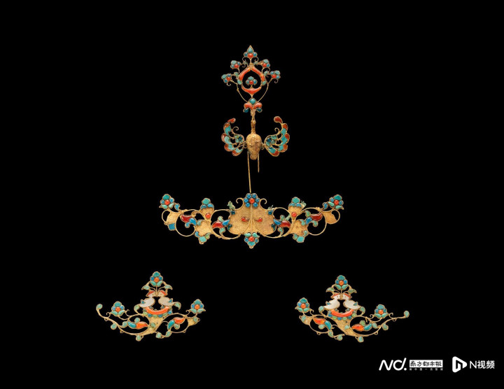 凤鸟鸳鸯衔花枝形冠饰唐(618-907年)金镶绿松石、红玛瑙、玻璃、珍珠母香港故宫文化博物馆